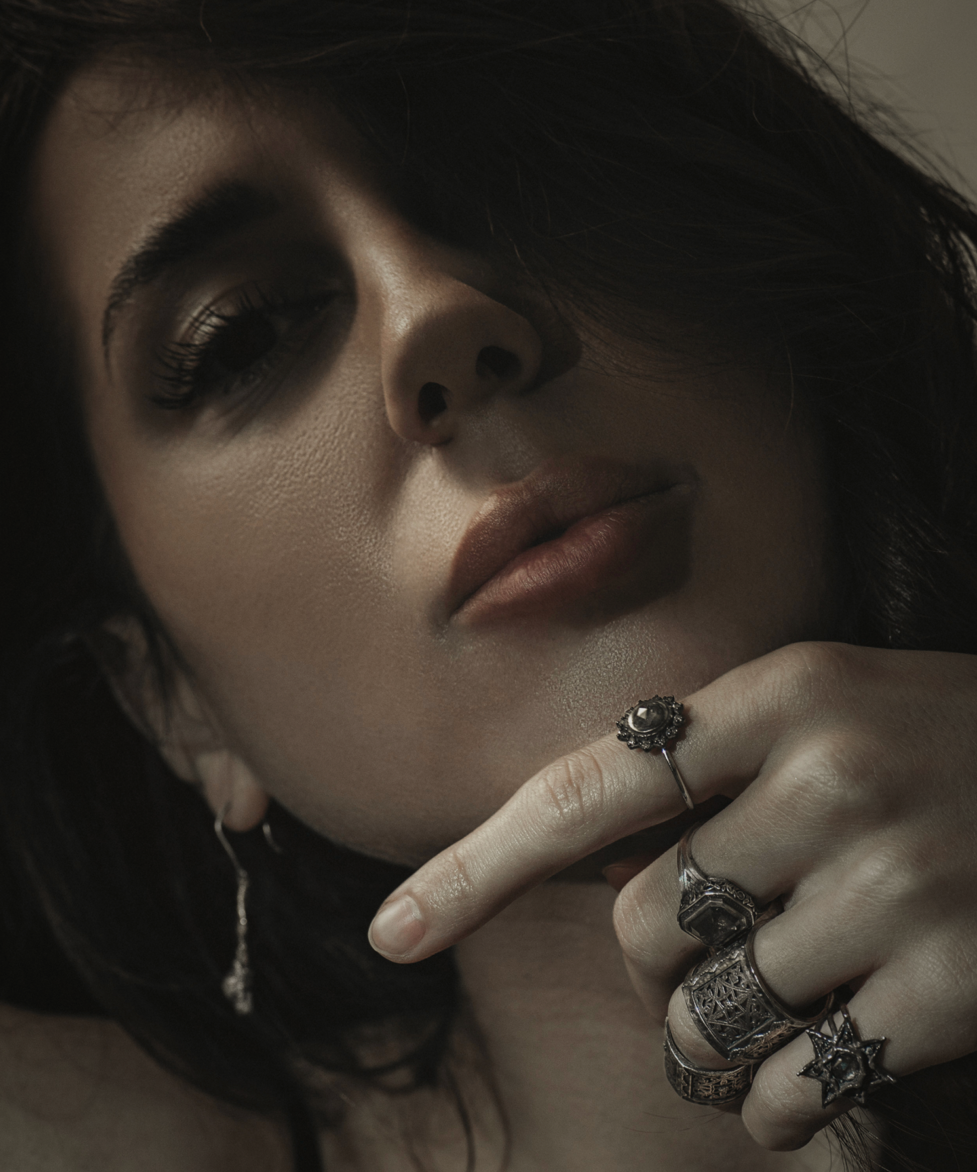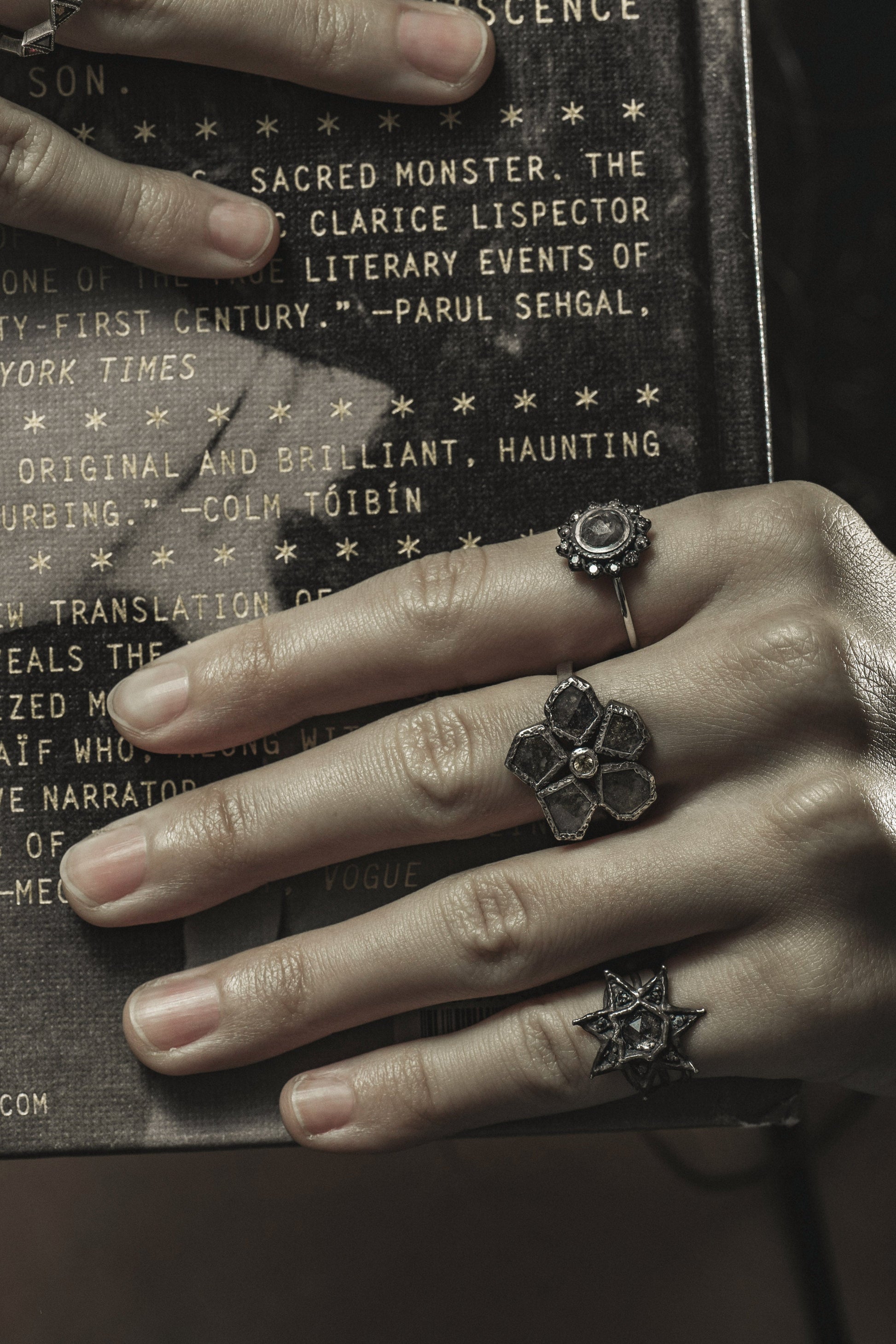 The Lunara Ring features a rose-cut gray diamond set in a rustic bezel, accented by smaller salt-and-pepper diamonds in a compass-style prong setting.