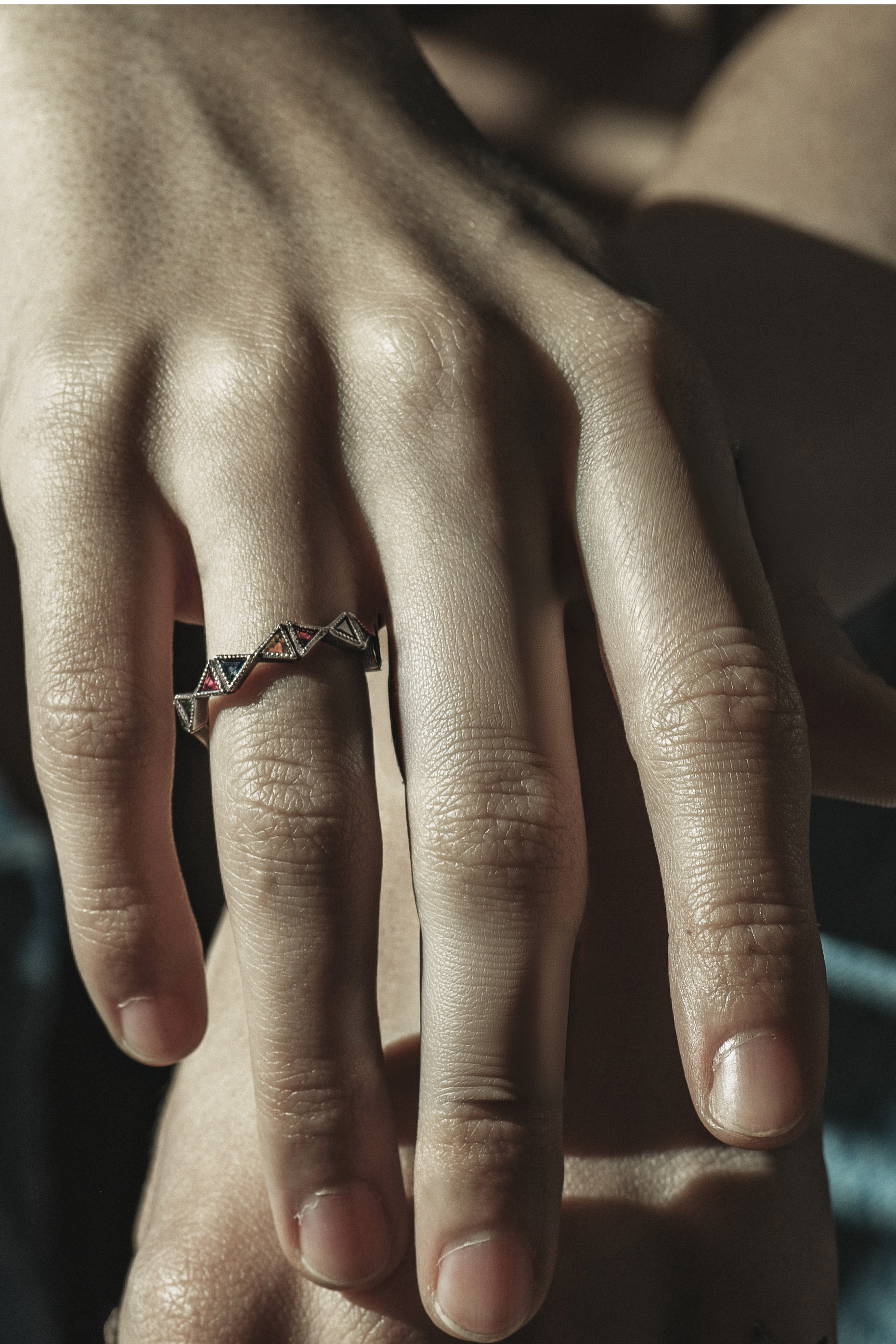 Triangular-cut rubies, sapphires, emeralds, and citrines form a radiant mosaic of color, each set in oxidized, granulated silver bezels like fragments of stained glass. Inspired by the grandeur of Persian architectural windows, Prism Verse transforms light and structure into a bold statement of design.